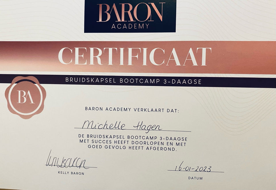 gecertificeerd Bridal stylist - diploma haar & Make-Up by Kelly Baron